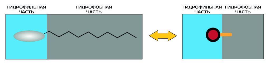 Рисунок 1. Схематическое изображение ПАВ, которое содержит как гидрофильную, так и гидрофобную часть. Благодаря этому становится возможным стабилизировать пены.