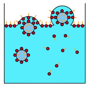 Для стабилизации пен используются специальные вещества с двойственными свойствами — поверхностно-активные вещества (ПАВ), молекулы которых могут «поворачиваться» разными сторонами к водной и неводной средам (Рис 1). Полярные (гидрофильные) группы молекул ПАВ находятся в водной фазе, а неполярные (гидрофобные) радикалы ориентированы строго в направлении неполярной среды – газовой или неводной («масляной»). В простейшем случае молекулы ПАВ схематично можно представить в виде чёрточки (гидрофобный радикал), на конце которой находится кружок (полярная группа).