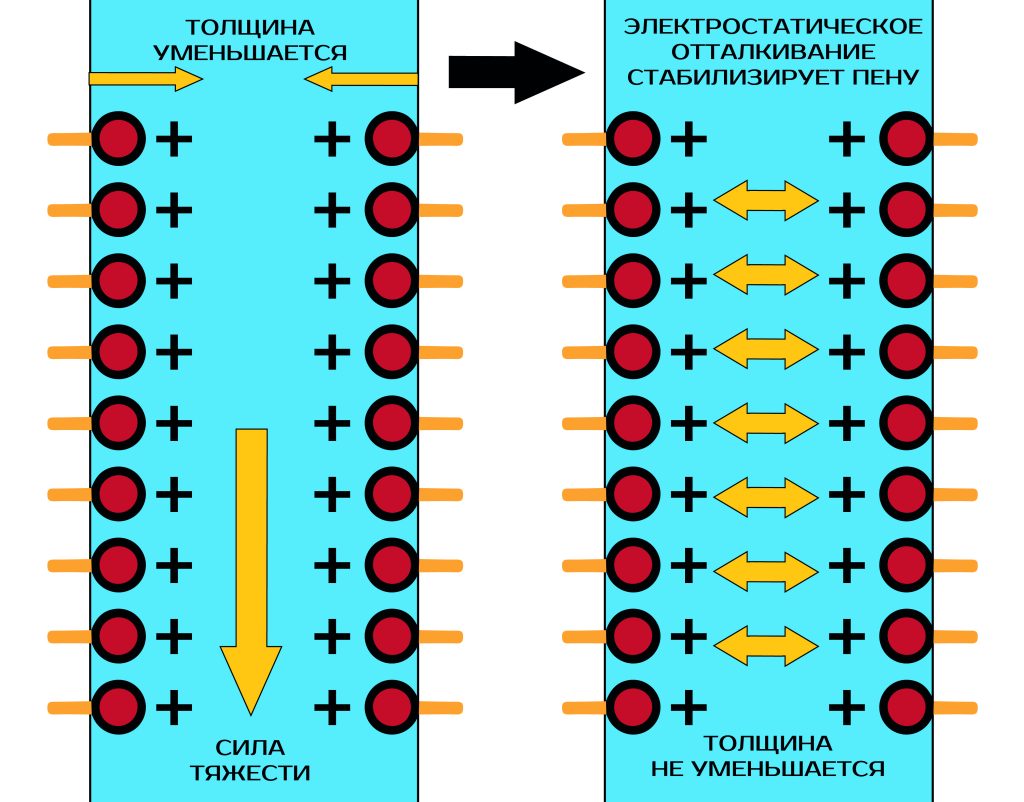 Рисунок 3. Процесс стабилизации пены. В данном примере частицы с положительными зарядами отталкиваются друг от друга, что не позволяет стенке истончаться