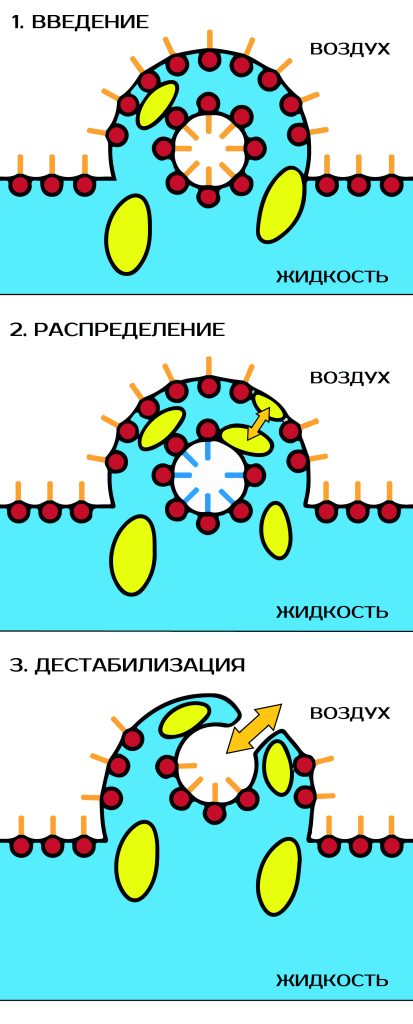 Рассмотрим теорию разрушения пены. Для этого необходимо выполнения двух условий успешной работы пеногасителя: