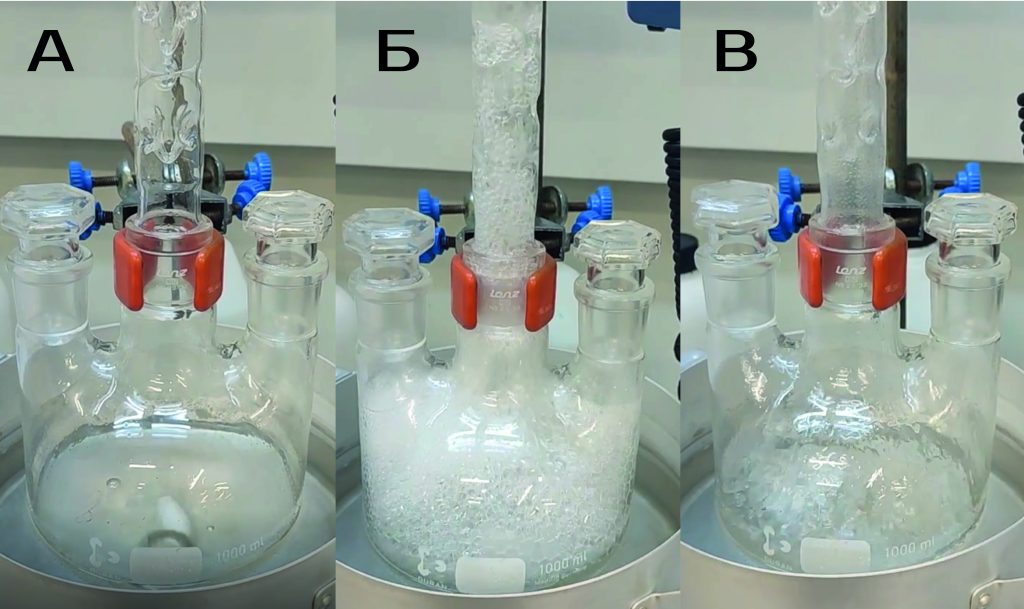В – добавка в исходный раствор пеногасителя PLEX® DryDistill, снижение давления до 10 мм.рт.ст., равномерное кипение.