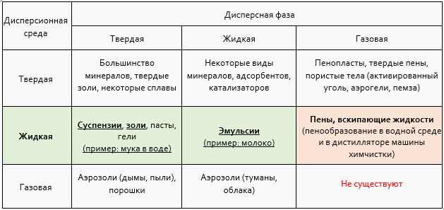 Дисперсные системы классифицируют по агрегатному состоянию образующих систему фаз (таблица 1). В таблице цветом выделены те системы, которые важны в индустрии химчисток и прачечных.