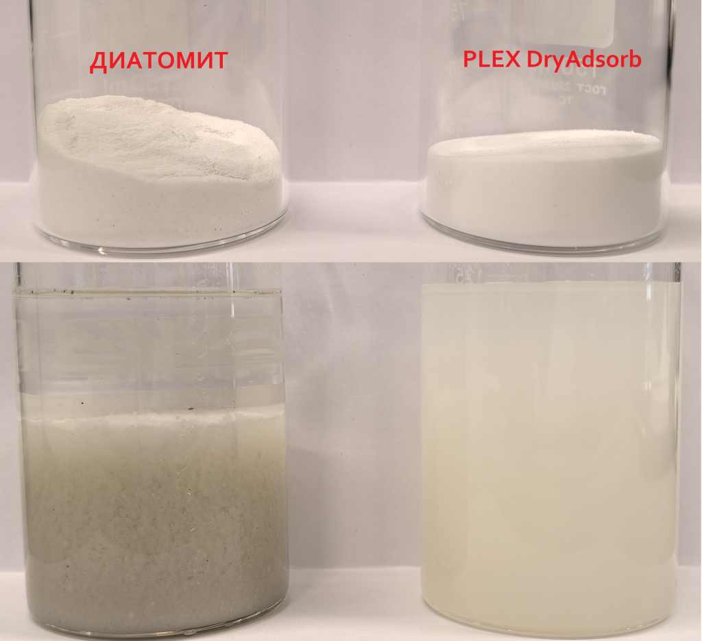 Компания PLEX®, изучив данную тему, предложила для рынка собственное решение — фильтровальный сорбционный порошок PLEX DryAdsorb, который обладает радом преимуществ: